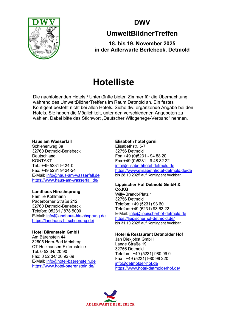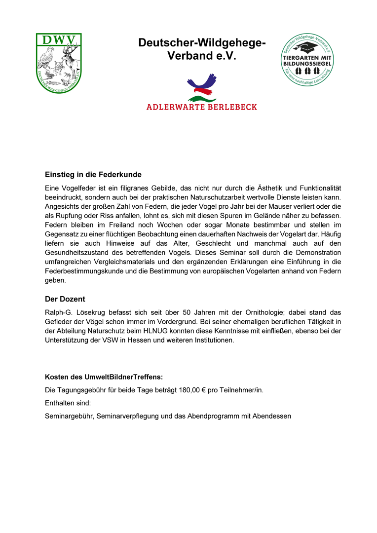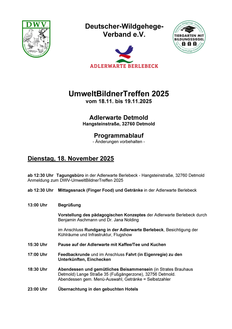 Hiermit laden wir laden wir alle Interessierten UmweltBildner (Mitgliedschaft im DWV e.V. ist keine Teilnahmevoraussetzung) zum UmweltBildnerTreffen 2025 des Deutschen Wildgehege-Verbandes e.V. in der Adlerwarte Berlebeck in Detmold